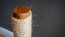 And finally it was time to add the sisal rope. I picked up 30m of this natural fibre rope on amazon for around £7, and used about half of it on the post. I secured it at the top and bottom with some roofing nails (which would face the wall to ensure that my cat doesn't catch his claws in it) and wrapped it tightly around the post. I considered gluing it with hot glue but it wasn't necessary, as the fibres of the rope when pulled tightly next to each other hold in place pretty well.