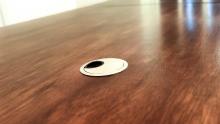 You'll see that this half already had a cable grommet in the centre, and I needed to add one of those to the other half too - I used a 60mm holesaw to drill the holes.  I had to buy a new set of holesaws on Amazon too because my old set didn't have a 60mm size, this one is by Draper and I'll link to it in the description box beow.  Fortunately this was delivered in time, unlike the varnish.