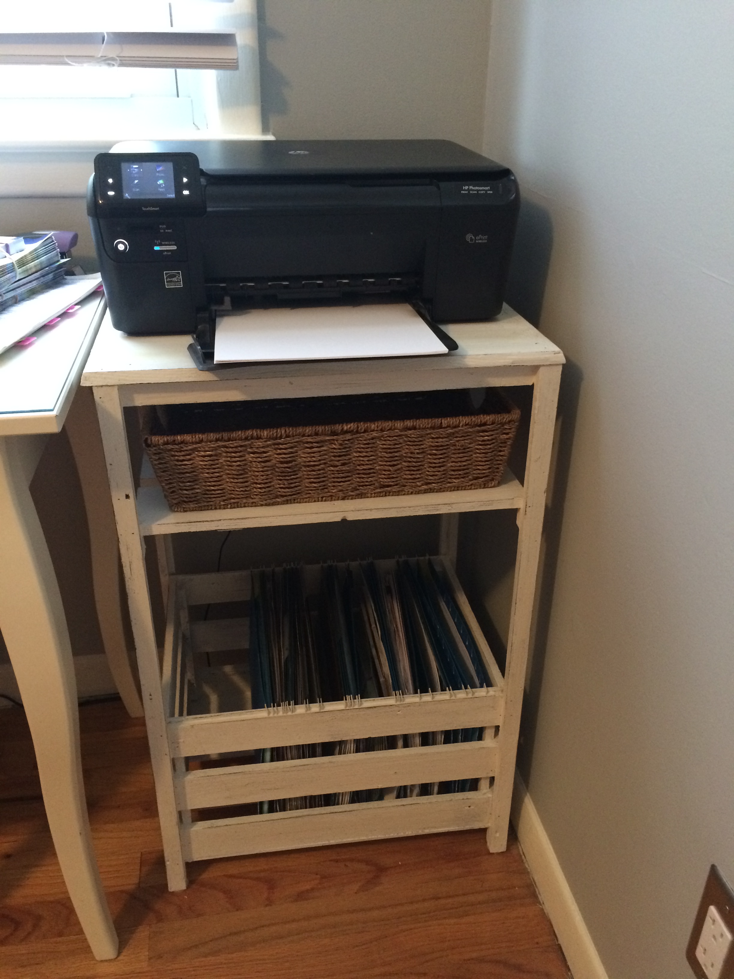 What a fantastic looking stand - crisp, white and modern. Love the improvised hanging file system and the basket fits perfectly! Thanks for sharing Lou.